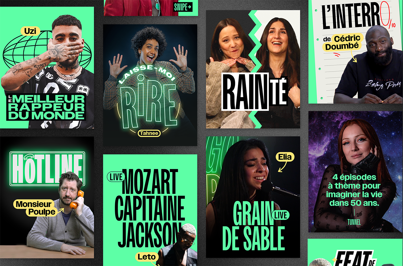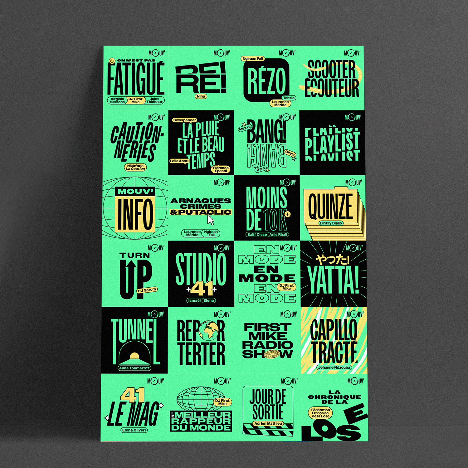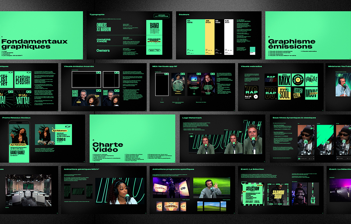 I had the chance to shape the artistic direction of MOUV’ Radio — a project as challenging as it was inspiring — developed in close collaboration with the Radio France teams. The mission was to reinvent the radio’s visual identity, shifting it toward digital platforms, video content, and emerging audience habits. I leaned into a bold, punchline-driven aesthetic, paired with a minimalist color palette where the iconic green and black create a huge visual contrast. I introduced a variable typeface to reflect the multiplicity of voices and tones that define MOUV’, flexible and expressive while keeping the overall system cohesive.
